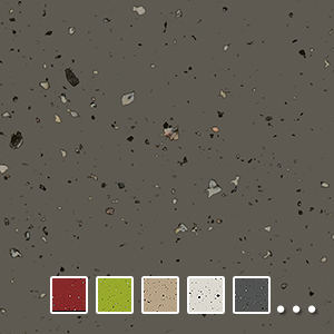 Rubber flooring with a varied combination of materials, comprising permanently resilient rubber and randomly dispersed granite chips, in two timeless design variations.