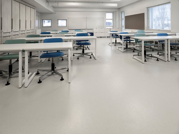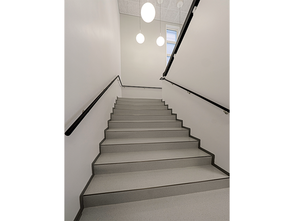 “In terms of design, we opted for 3.5 mm norament 926 satura nTx tiles in beige. A few small inlays in various shades of blue set chic accents”, explained interior designer Ulla Uitto. Additionally, nora stairtreads were to give the corridors and classrooms the same harmonious appearance as the stairway. “As far as the type of installation was concerned, we decided on nora nTx, as this ensured that there would be no undesired interactions with the subfloor and that the installation would be completed more quickly than usual”, said Arosarka. This is how installation with nora nTx works: a rubber-based adhesive is applied to the underside of the nora floor coverings and covered with a protective film, which is removed before installation. On site, the first task is to sand the old substrate, vacuum and prime it. After that, you simply cut the new floor covering to size, remove the protective film, align it, smooth it out, roll it and you’re done. The floor is immediately ready for use.