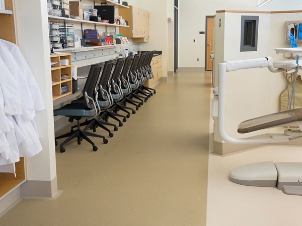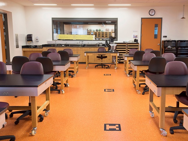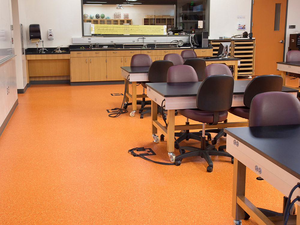 The COCC Science Center opened its doors last fall, and at the core of the 45,000-square-foot building are biology, chemistry and physical science labs that are connected to adjacent public hallways by large interior windows. Each of the labs are color-coded to identify their affiliated department, which made it important for architects to find a floor covering whose color palette complemented their colorful vision for the space. The school also required a floor with the ability to resist both chemical spills and the movement of equipment and furniture in the labs. norament® grano met these design and performance challenges, while offering other important advantages to the college. Students and staff are enjoying comfort underfoot as they stand for extended periods of time on the resilient flooring, and the school took an important step toward securing its Earth Advantage Commercial certification, thanks in part to the sustainable properties that characterize all nora® flooring products.