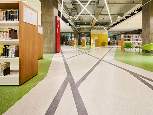Every department has its individual colour scheme: noraplan® lona in a friendly green and earthy shades was installed in the adult reading areas, the youth library was fitted with brown flooring, the LibraryLab floor is red and the children’s library was given green floor coverings. The grand staircase is an absolute show-stopper. At almost five metres wide, it leads from the spacious foyer to the third floor and is fitted with rubber floor coverings in a bright and sunny yellow. The area around the atrium and the Real Labor on the third floor were also fitted with yellow flooring. In the children’s library a blue inlaid river snakes through a green meadow. This was achieved using innovative technology at the inlay centre of the Weinheim rubber specialists, where they use ultrasonic cutting systems to produce motifs, logos and lettering of all kinds with the highest precision. The endless inlay design options and dimensional stability of the rubber material mean the coverings can be installed without joints and give you almost limitless freedom of design – and not just for floors. For example, the rubber floor coverings have been used as colourful stylistic elements on the tiered seating and stage located on the third floor and in the LibraryLab.