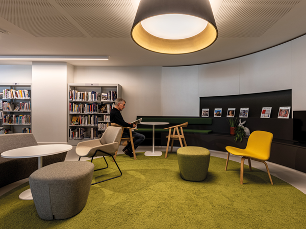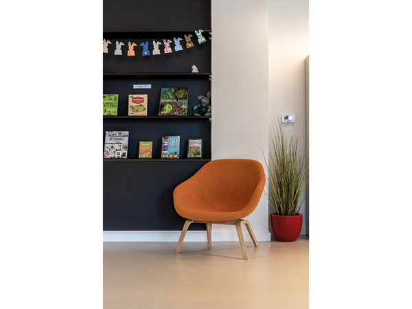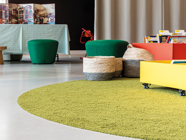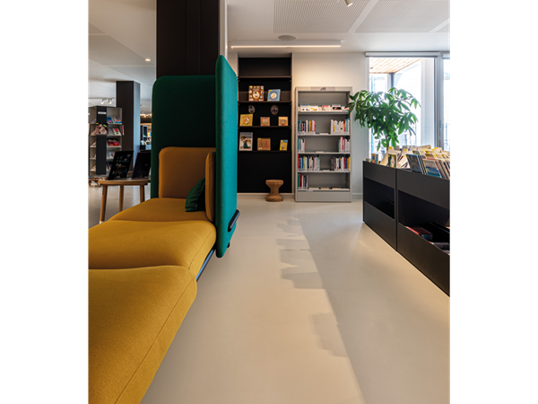 Measuring almost 500 m2, the new media centre offers the perfect environment for sitting back with a book. There is an area for young persons, an activities room and an area for working, relaxing or playing on the consoles installed. There is also a cafeteria where visitors can unwind. Modern furnishings and the light grey rubber flooring convey a friendly, open atmosphere. The monochrome aesthetic of the noraplan floor covering has a calming effect on the space and skilfully accentuates the colourful elements of the interior. The light grey flooring highlights the green island of Human Nature carpeting, which adds a natural element to the centre and creates a comfortable atmosphere. The warm rubber flooring and soft carpet are also suitable for sitting on, making them the perfect surface for children.