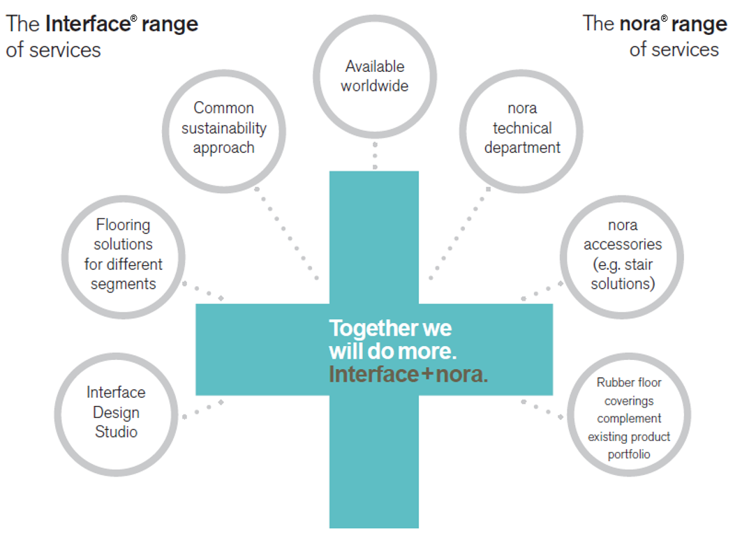 nora’s strength in the healthcare, industry and transportation segments complements Interface’s strength in corporate office and hospitality, while both brands are strong in the education segment.