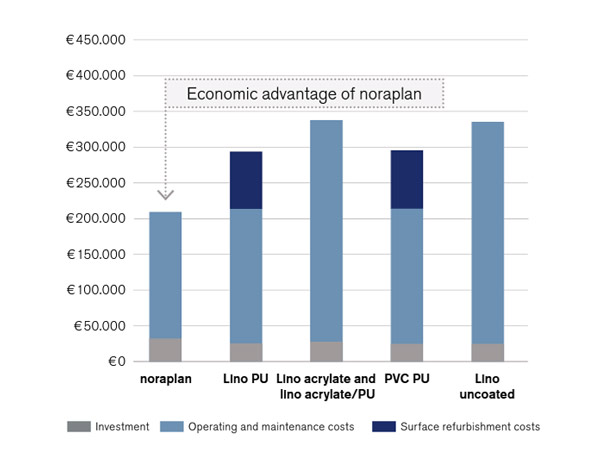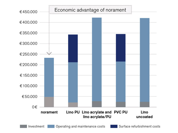 Economic analysis of flooring shows that investment costs represent only a small part of total costs. Up to 90% of the costs will only be incurred later, in its useable life. These include regularly recurring protective film restoration, basic cleaning, the application of new coatings, and the associated downtime costs. norament and noraplan, in contrast, are uniquely economical over their useable life thanks to their low follow-up costs.
