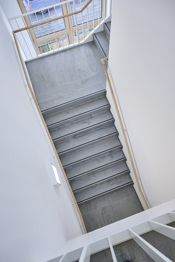 Formtreppen mit flacher, richtungsorientierter Reliefstruktur mit feinem Korndesign und moderner Marmorierung, Trittschallverbesserungsmaß 12dB.