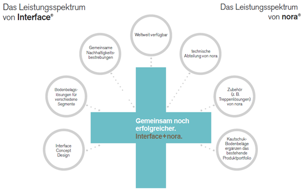 Interface und nora passen perfekt zusammen, denn die Produktportfolios ergänzen sich ideal ohne Überschneidungen. Gemeinsam bieten wir eine hervorragende Kombination aus Produkten und Anwendungserfahrung, um unseren Kunden auf der ganzen Welt neue Räume zu eröffnen – mit einer noch besseren internationalen Serviceabdeckung und Produktverfügbarkeit.