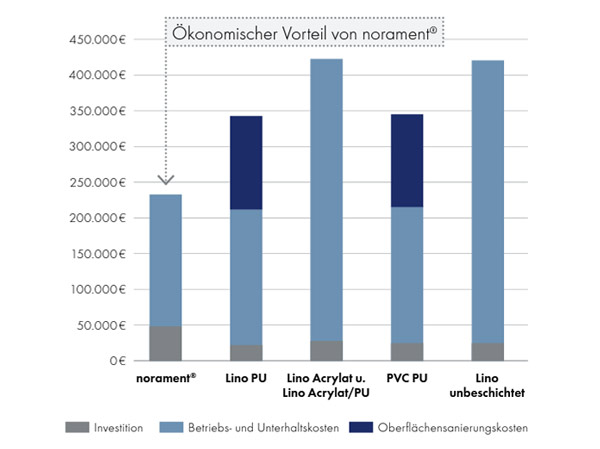 Die Wirtschaftlichkeitsbetrachtung eines Bodens zeigt, dass die Investitionskosten nur einen geringen Teil der Gesamtkosten ausmachen. Bis zu 90 Prozent der Kosten fallen erst im Laufe der Nutzungsdauer an. Dazu gehören auch regelmäßig wiederkehrende Sanierungen temporärer Oberflächenbeschichtungen, die oft mit alkalischen Grundreinigungen und Neubeschichtungen verbunden sind. Durch das Aus- und Wiedereinräumen der Räume, das Sperren entsprechender Flächen wegen notwendiger Trocknungszeiten entstehen Aufwendungen für Personal sowie Ausfallzeiten und damit Kosten.