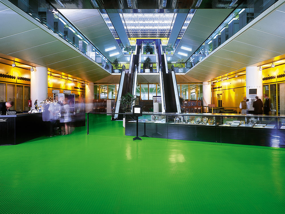 Charmante alte Gassen, einladende Pubs, überdurchschnittlich viele Museen, ein traditionsreicher Fußballclub: Es gibt sicherlich viele gute Gründe, um Ipswich einen Besuch abzustatten. Für Architekturstudenten aus aller Herren Länder bietet die Stadt an der Ostküste Englands einen ganz besonderen Anziehungspunkt: die Friars Street. Die Hausnummer 15 beherbergt heute den Firmensitz des britischen Finanzdienstleisters Willis Towers Watson. Das 1975 entstandene Bürogebäude gilt als Pionierleistung im Bereich der Büroarchitektur, geschützt als internationales Kulturgut, geplant und umgesetzt von Lord Norman Foster und Partnern. Mit seinem Entwurf war der britische Stararchitekt damals seiner Zeit um Jahre voraus: Mit offenen Räumen, wenigen Etagen, einem Dachgarten mit Restaurant und bahnbrechenden Materialien wie dem norament® Noppenboden von nora systems. Foster wünschte ein Bodenmaterial, das überall einsetzbar war, vom Foyer bis zum Technikbereich. Foster hatte auch hier die Zukunft im Blick und war auf den technologischen Fortschritt vorbereitet: So ging Jahre später die Umstellung von Schreibmaschinen zu elektronischen Textverarbeitungssystemen problemlos über die Bühne – möglich machten es im Gebäude verlegte Doppelböden, in denen die Kabel der Computer Platz fanden. Ein Entwurf-Detail, das Mitte der 1970er Jahre revolutionär war. So wie auch die Farbe des Bodens. Das sogenannte Ipswich-Grün, das Foster gemeinsam mit nora systems entwickelte und mit dem er die Natur ins Innere holte. Der Boden wurde 1998 bei Erweiterungsmaßnahmen in der Originalfarbe und im Ursprungsformat von nora systems geliefert.