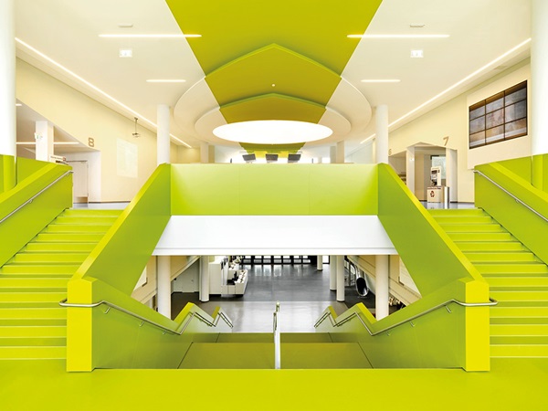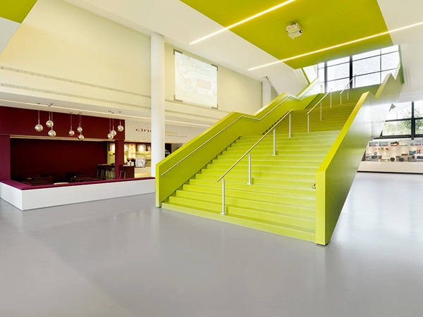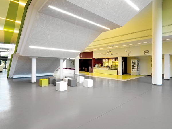 The designer wanted the floor covering in the new multiplex cinema to underscore an homogeneous overall appearance, round off the unusual design concept and discreetly put the interior into the limelight. Following in-depth research, Müll decided in favour of the rubber floor coverings from nora systems. noraplan uni in elegant grey and lime now forms a perfect contrast to the apple green, magenta, violet and white seat elements in the foyer. The stairways have also been laid with noraplan uni in green. “Among other things, its fine, silky shine really makes the floor covering stand out,” says the satisfied designer. Before the renovation, the cinema had been fitted with carpeting. For various reasons, Belinda Müll definitely wanted to avoid using a textile floor covering again, whereby durability, comfort and footfall noise insulation are critical factors for CinemaxX. And floor coverings from nora systems satisfy these criteria to the full.